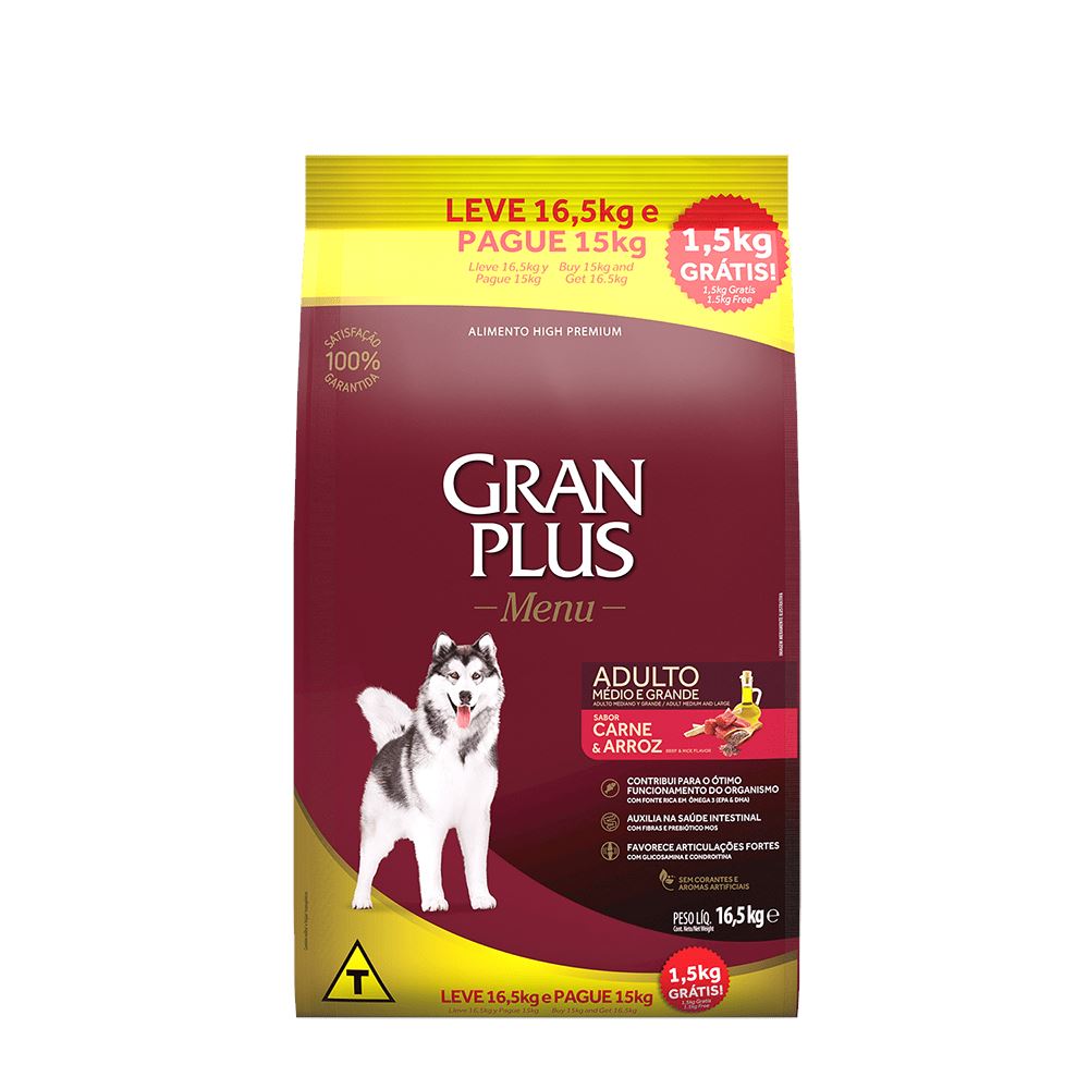 GRAN PLUS MENU CÃO ADULTO RAÇA MÉDIA E GRANDE (CARNE E ARROZ) - 16,5KG